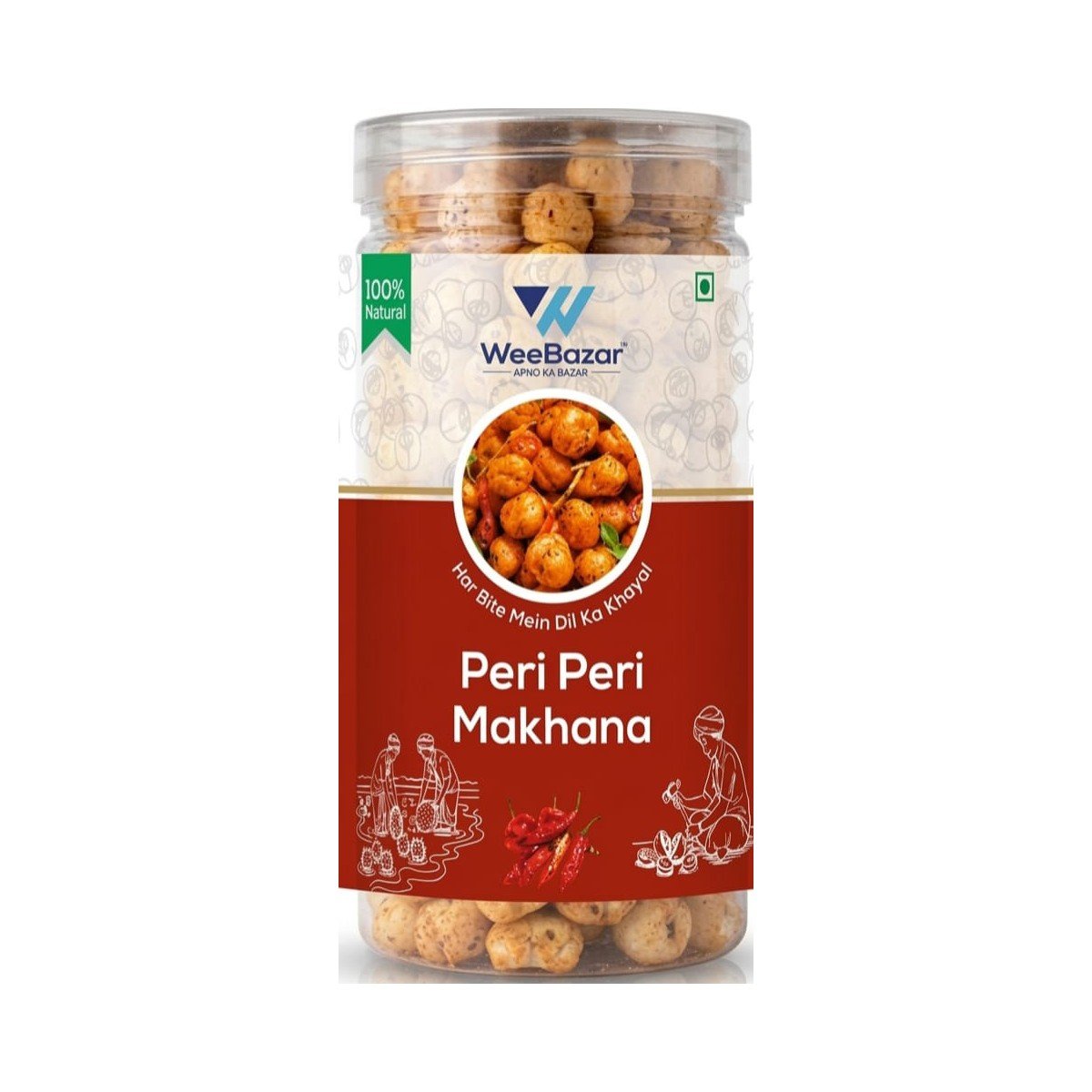WeeBazar Peri Peri Makhana is a flavorful twist on traditional makhana. Made from premium, unpolished fox nuts directly sourced from farmers in Darbhanga, Bihar, these makhanas are carefully roasted, not fried, and coated with a bold peri peri spice blend.