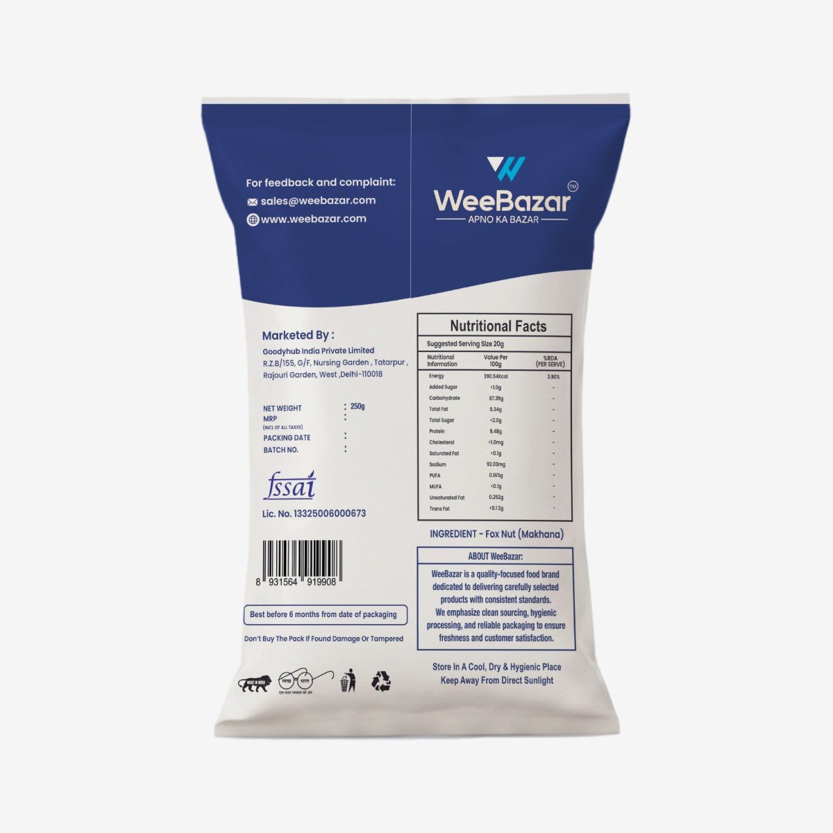 Upgrade your snacking with WeeBazar Premium White Makhana (Fox Nuts) — carefully handpicked for superior size, whiteness, and crunch. Sourced from trusted growers and hygienically processed, our makhana is a perfect blend of nutrition, purity, and taste.