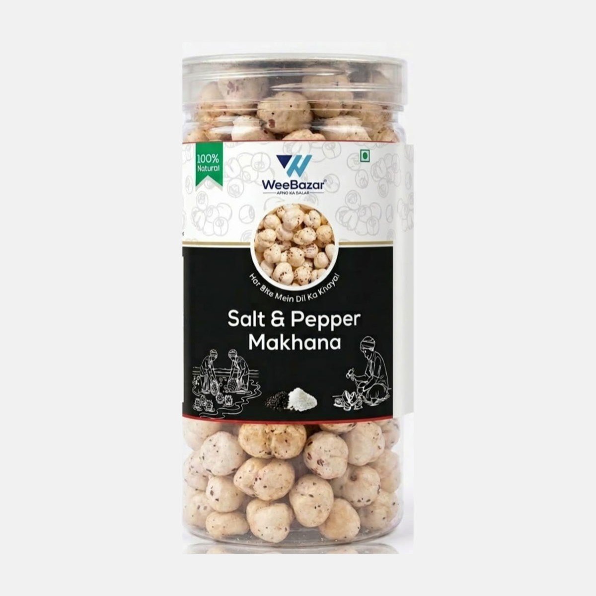 WeeBazar Salt & Pepper Makhana brings you the timeless combination of salt and black pepper on premium quality fox nuts. Sourced directly from Darbhanga farmers, our makhanas are unpolished, naturally processed, and roasted to deliver a light yet satisfying crunch.